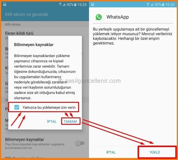 4- Burda dikkat etmeniz gereken en önemli kısım Yalnızca bu yüklemeye izin verin seçeneğini seçerek Tamam butonuna basmak. Bu şekilde telefonunuza arka planda herhangi bir apk dosyasının farkında olmadan yüklenmesine engel olabilirsiniz. En son olarakta uygulamanın yüklenmesini devam ettirmek için Yükle butonuna basıp işlemin bitmesini sağlıyoruz.
